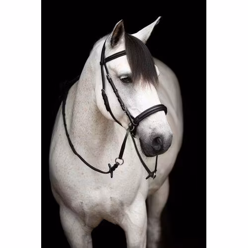 Tillverkat i förstklassigt amerikanskt läder. Mjukt fodrad nosgrimma och pannband.Rostfria söljor. Tyglar ingår ej.